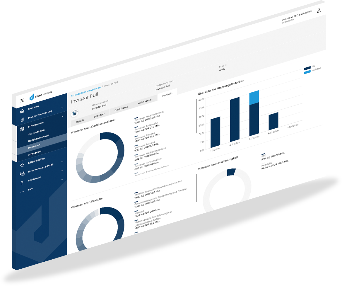 DV Schuldschein bildet den Single Point of Information für Investoren bei neuen und bestehenden Transaktionen. Die Plattform schafft eine neue Qualität für das Management von Schuldscheininvestments. Die Daten werden zentral aufbereitet, Dokumente strukturiert bereitgestellt und der Zeichnungsprozess erfolgt vollständig digital – intuitiv, transparent und ohne Medienbrüche.