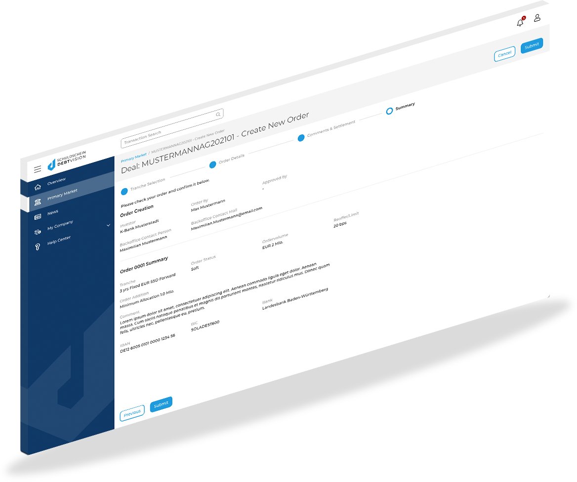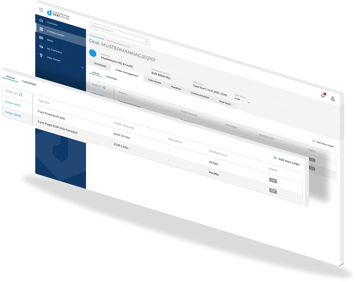 Investoren platzieren ihre Soft- und Firm-Orders mit wenigen Klicks direkt in der Plattform – vollständig digital. Fragen zur Transaktion werden über den integrierten Kommunikationsraum unmittelbar an Arrangeure und Darlehensnehmer gerichtet; sämtliche Korrespondenz kann für Protokollierungszwecke abgerufen werden. Nach Orderbuchschluss wird umgehend die Zuteilung inklusive finalem Pricing über die Plattform bereitgestellt.